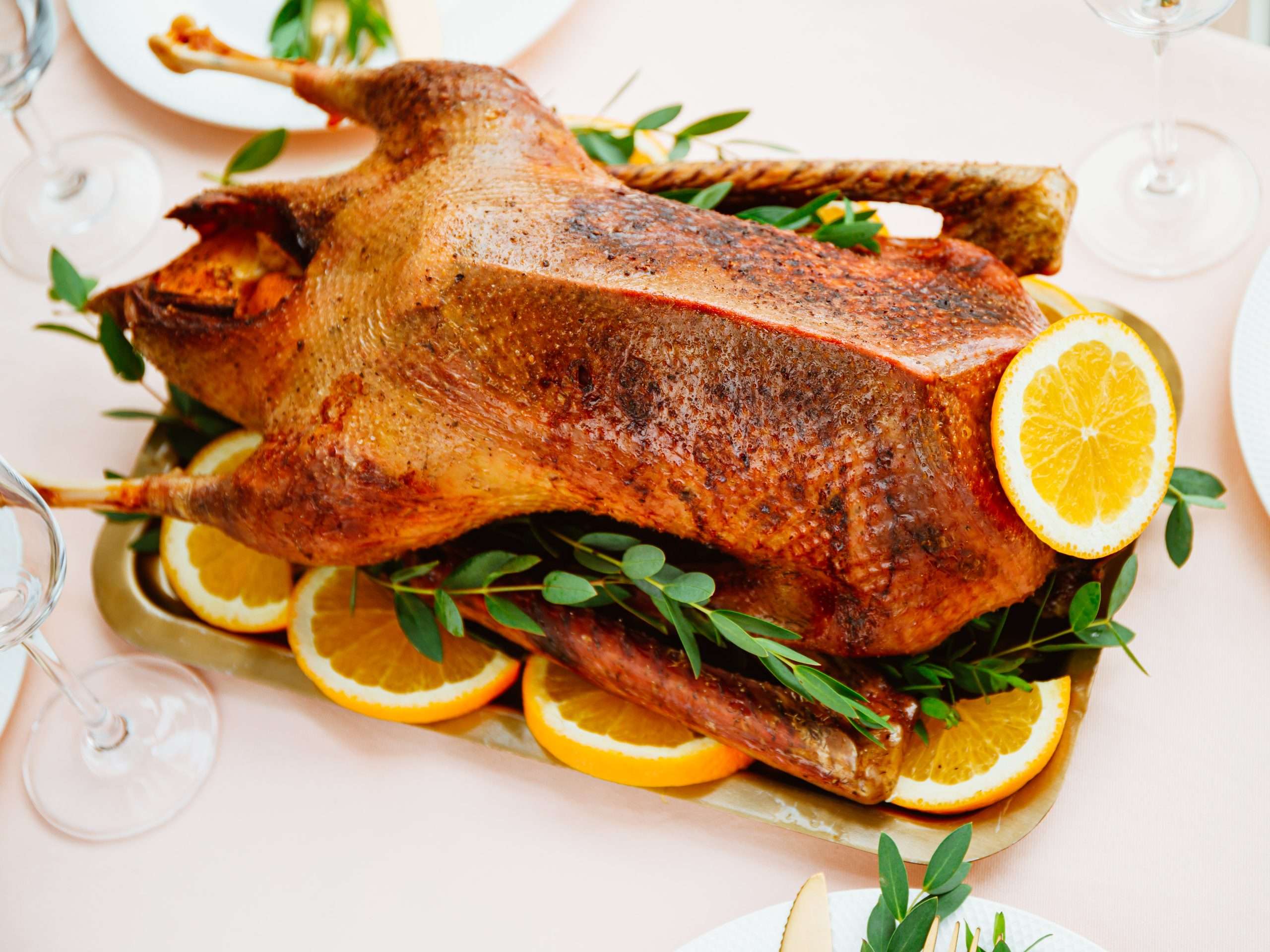 Roasted goose with oranges on a golden tray for celebrate event, Thanksgiving or Christmas family dinner.